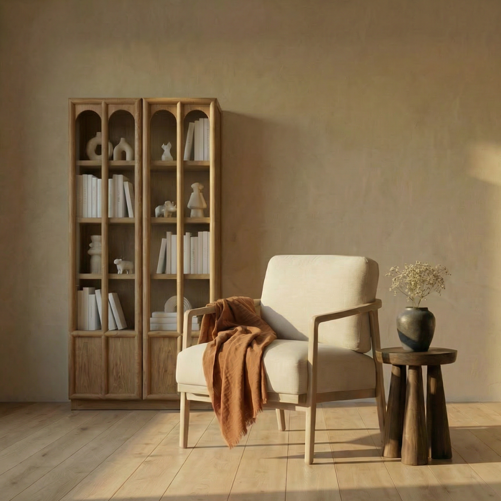 Athis, Double-Arch Recycled Pine, Bookcase/ Display Cabinet in Natural Limewash Finish, 40"L x 12"W x 79"H