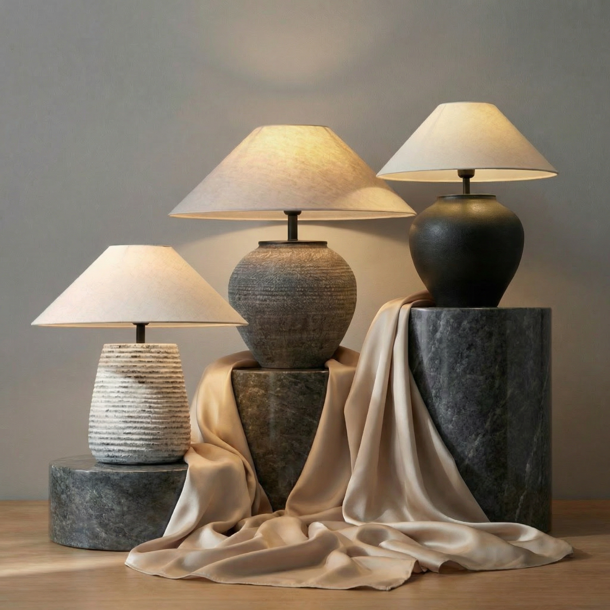 Amphora, Rustic Ceramic Base with Classic Fabric Shade, 19.7" D x 28.3" H